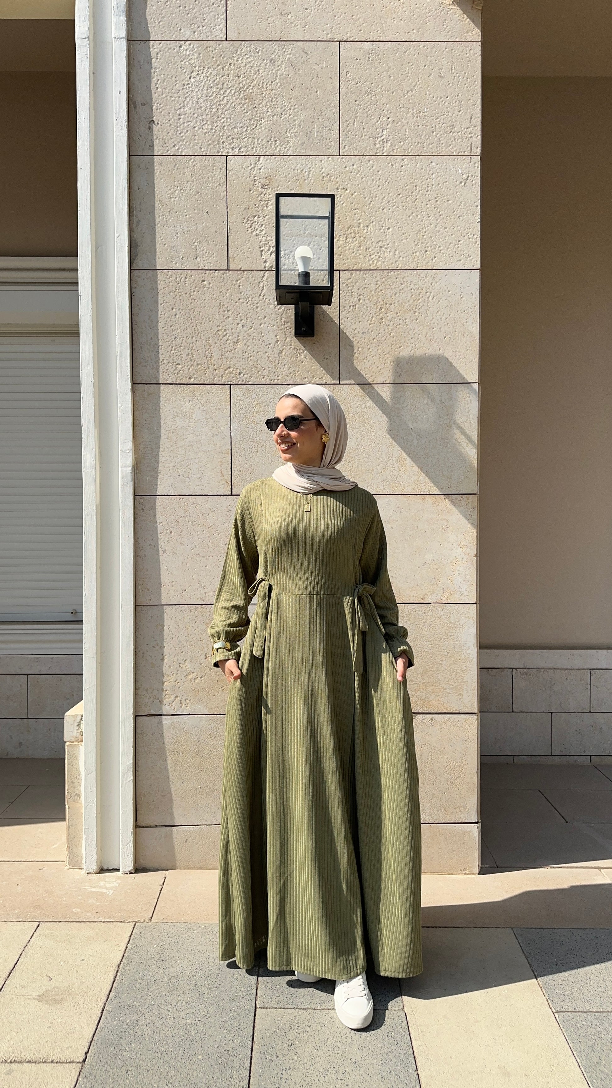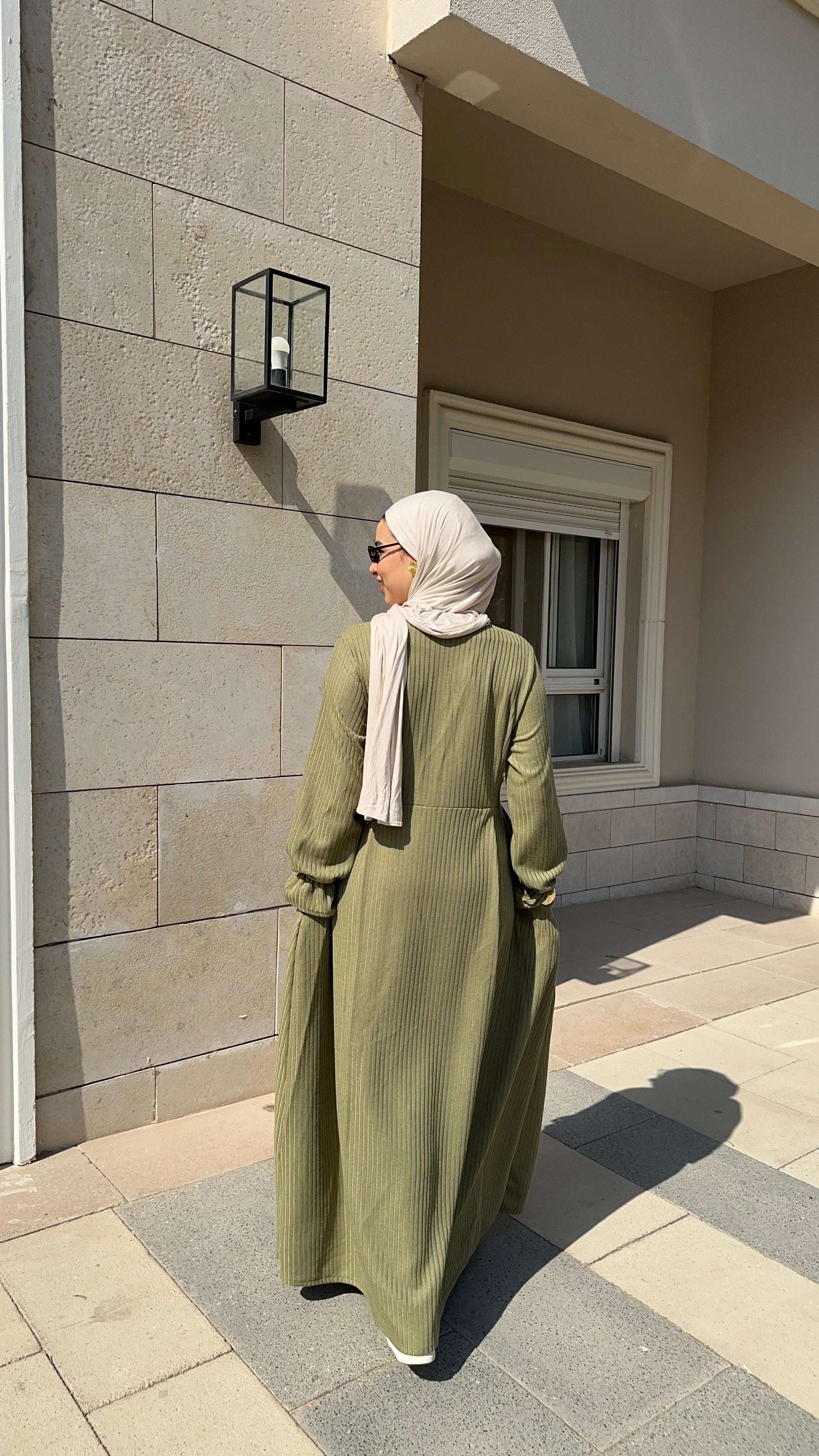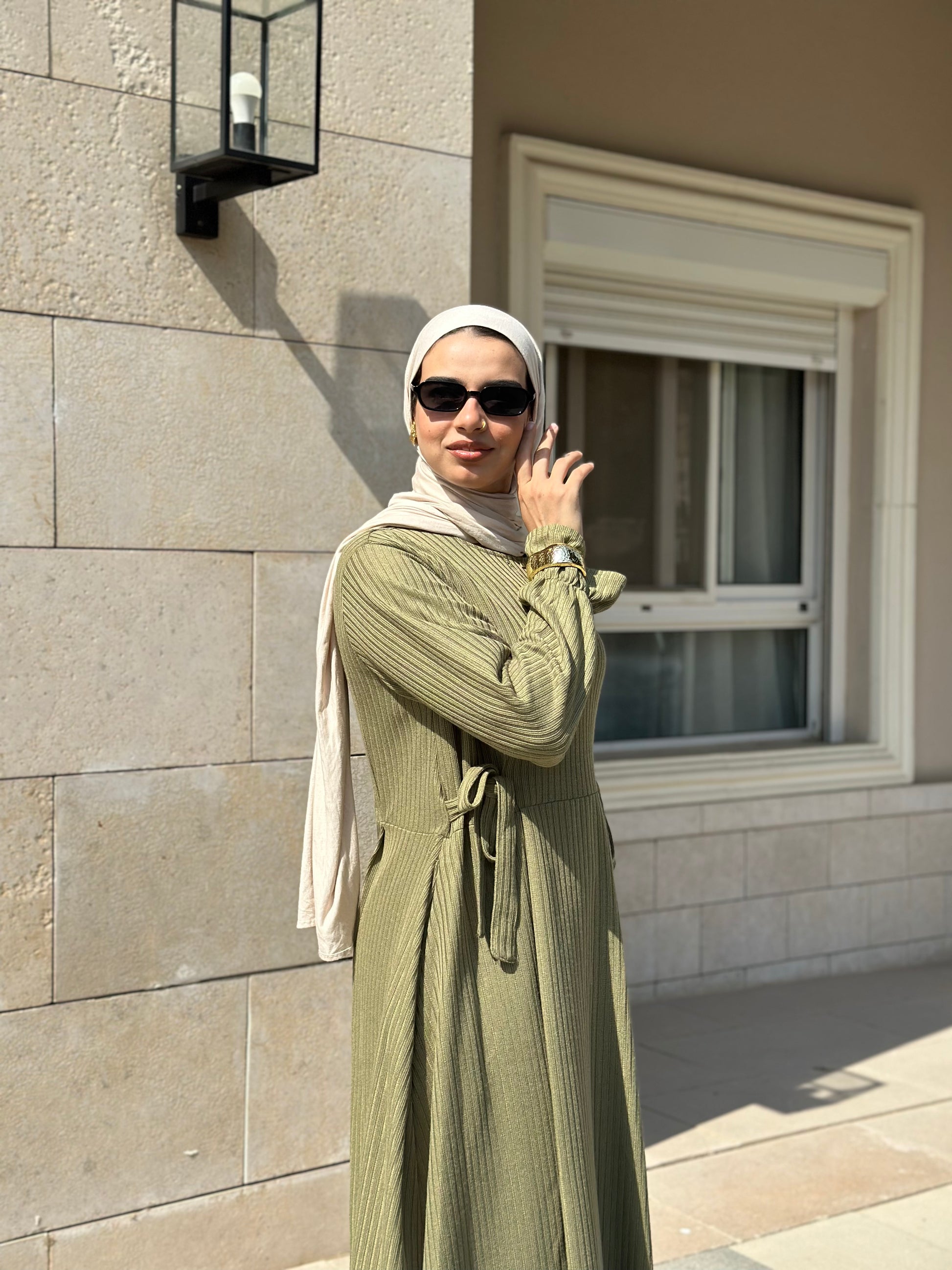 Olive green ribbed knit winter dress .